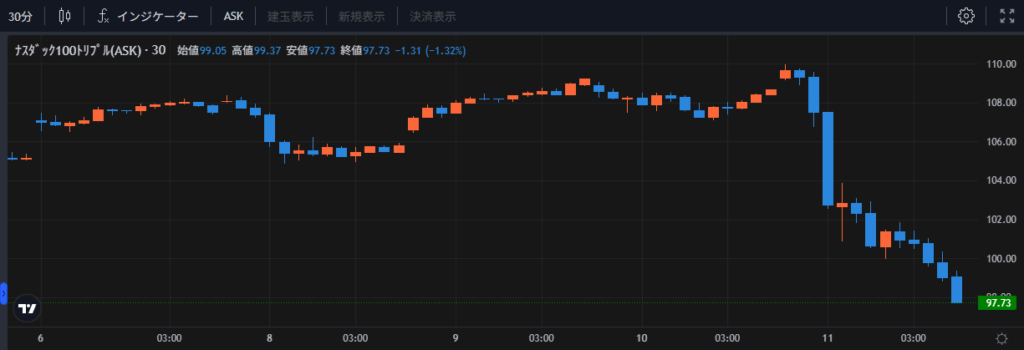 10/10(金)24:00頃、トランプ大統領による「11/1から中国への関税を100%にする」発言を受けて、大きな下落。